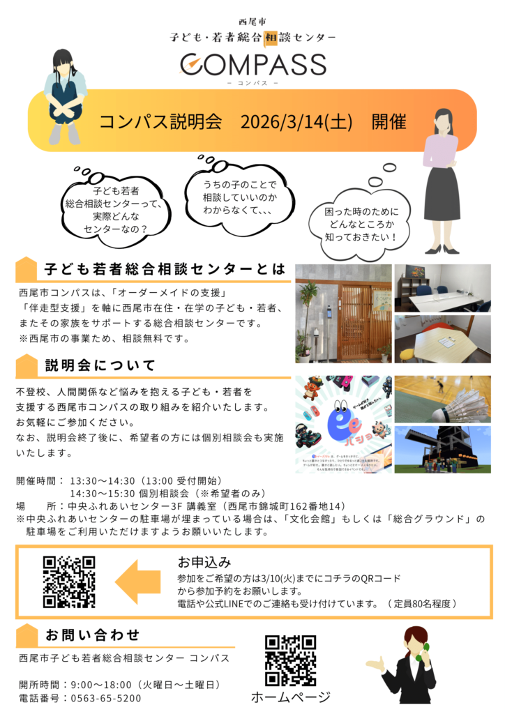 2021年に開所した子ども若者総合相談センター コンパス は不登校や人間関係など様々な悩みを抱える子ども・若者とその保護者の相談を受けオーダーメイドの支援を行うワンストップの総合相談センターです。西尾市が一般社団法人パーソナルラボに業務委託し、運営しています。専門の国家資格保持者等を中心とした相談員が常駐しており、年間400人以上の西尾市民が利用しています。